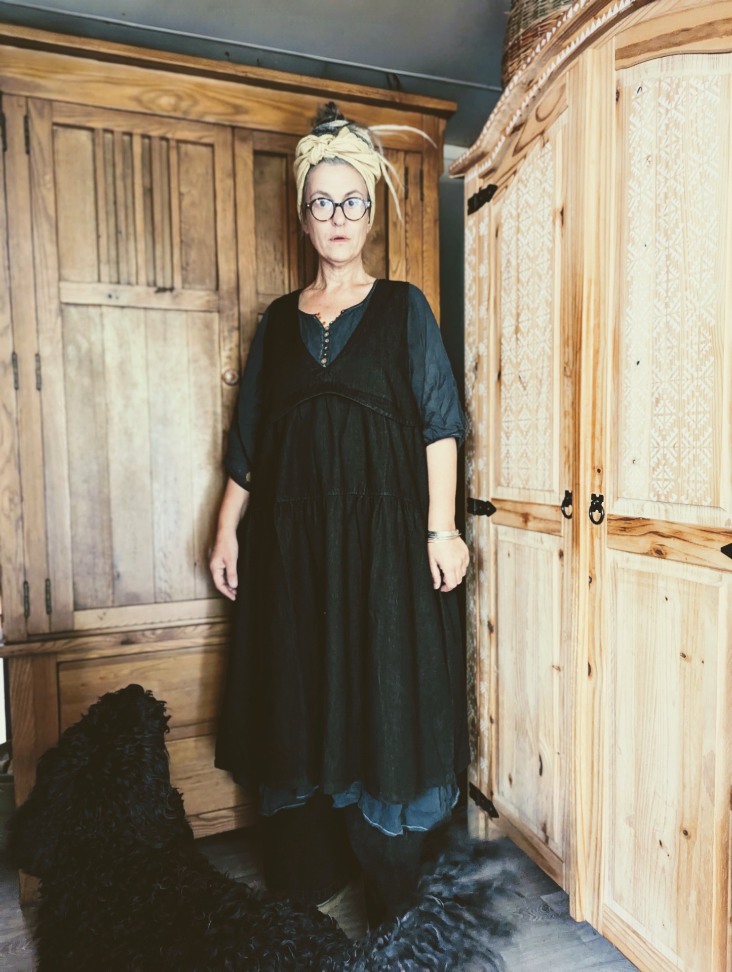 everyday throw over warm faded out black denimtwo side pocketsdeep v neckbig arm holes
