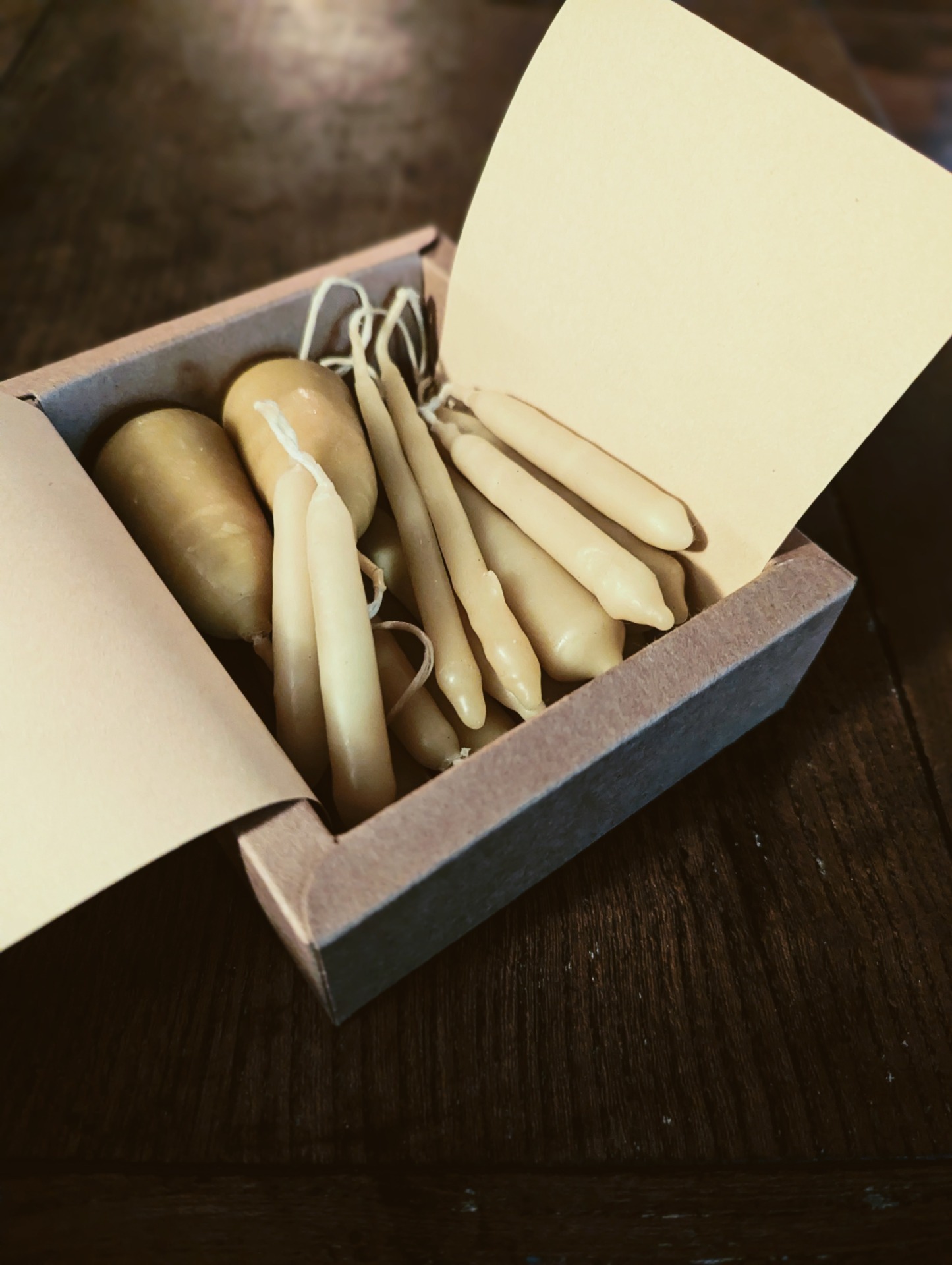 a sweet selection of tiny hand dipped beeswax candles you can even burn the 'beeswax tag' just remember to trim your wicks