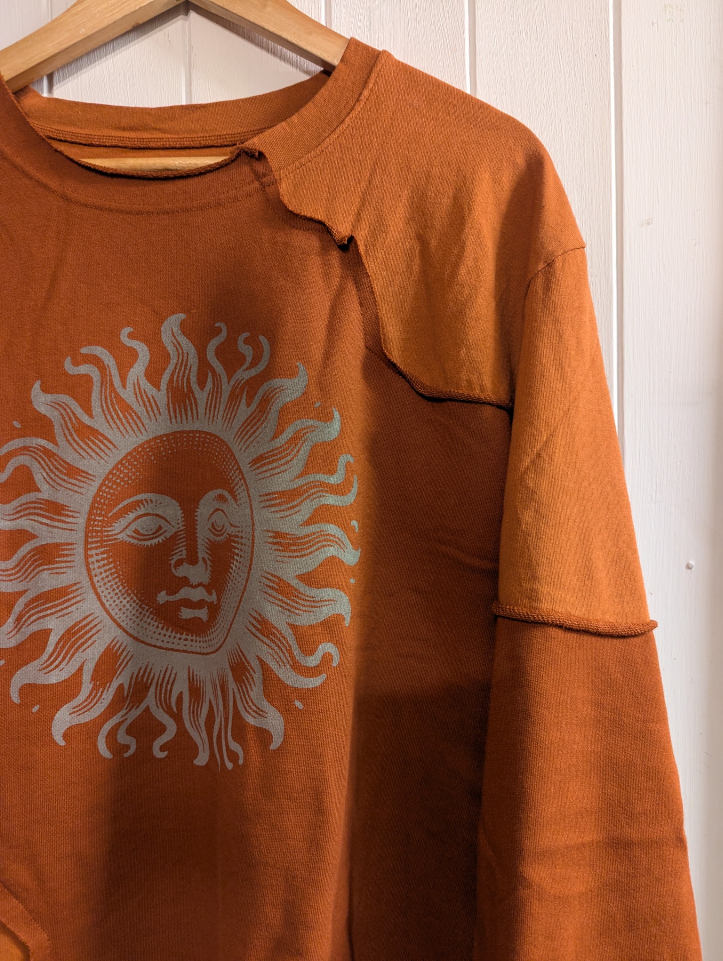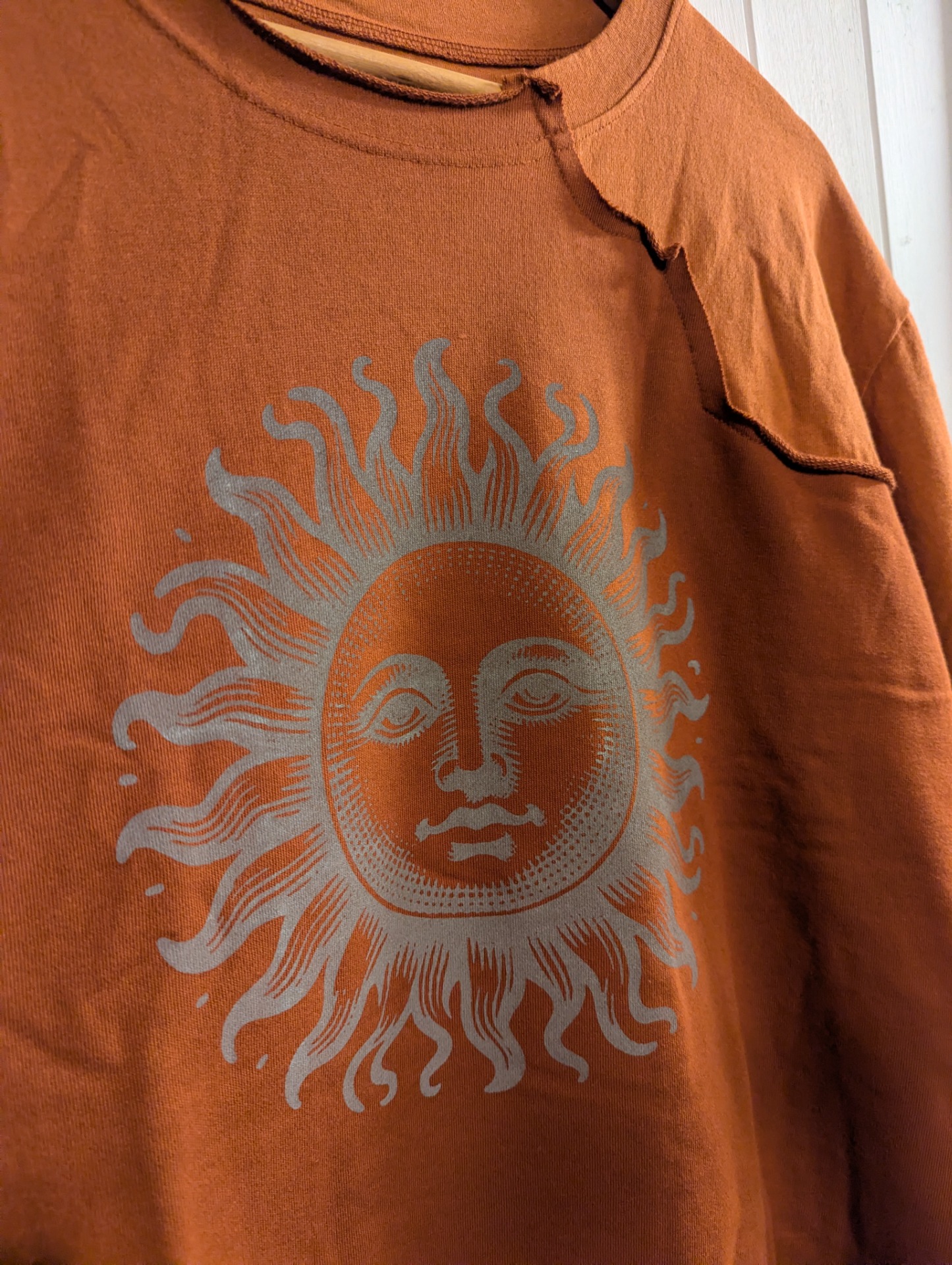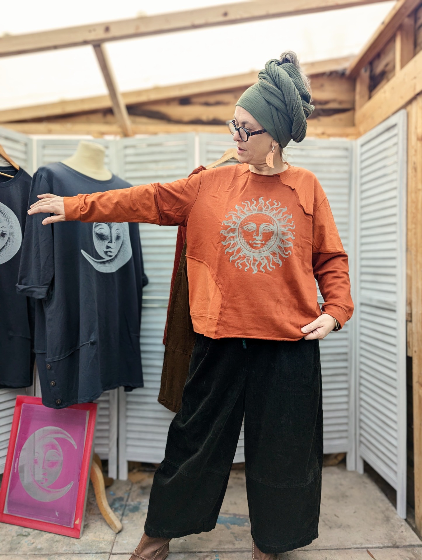 burnt ginger colour with out lovely 'sun face' screen print in a pale mushroom colour...fab.