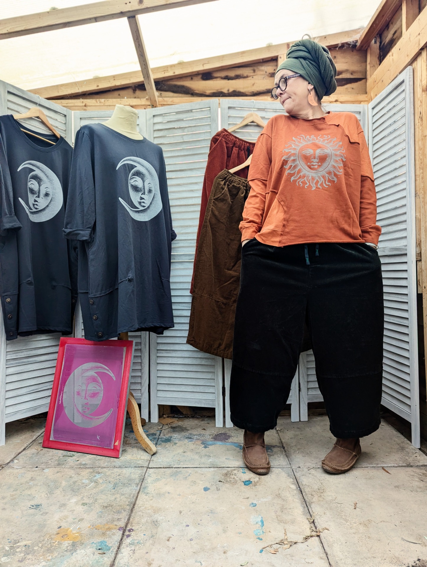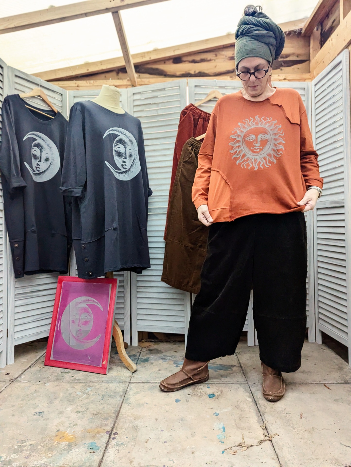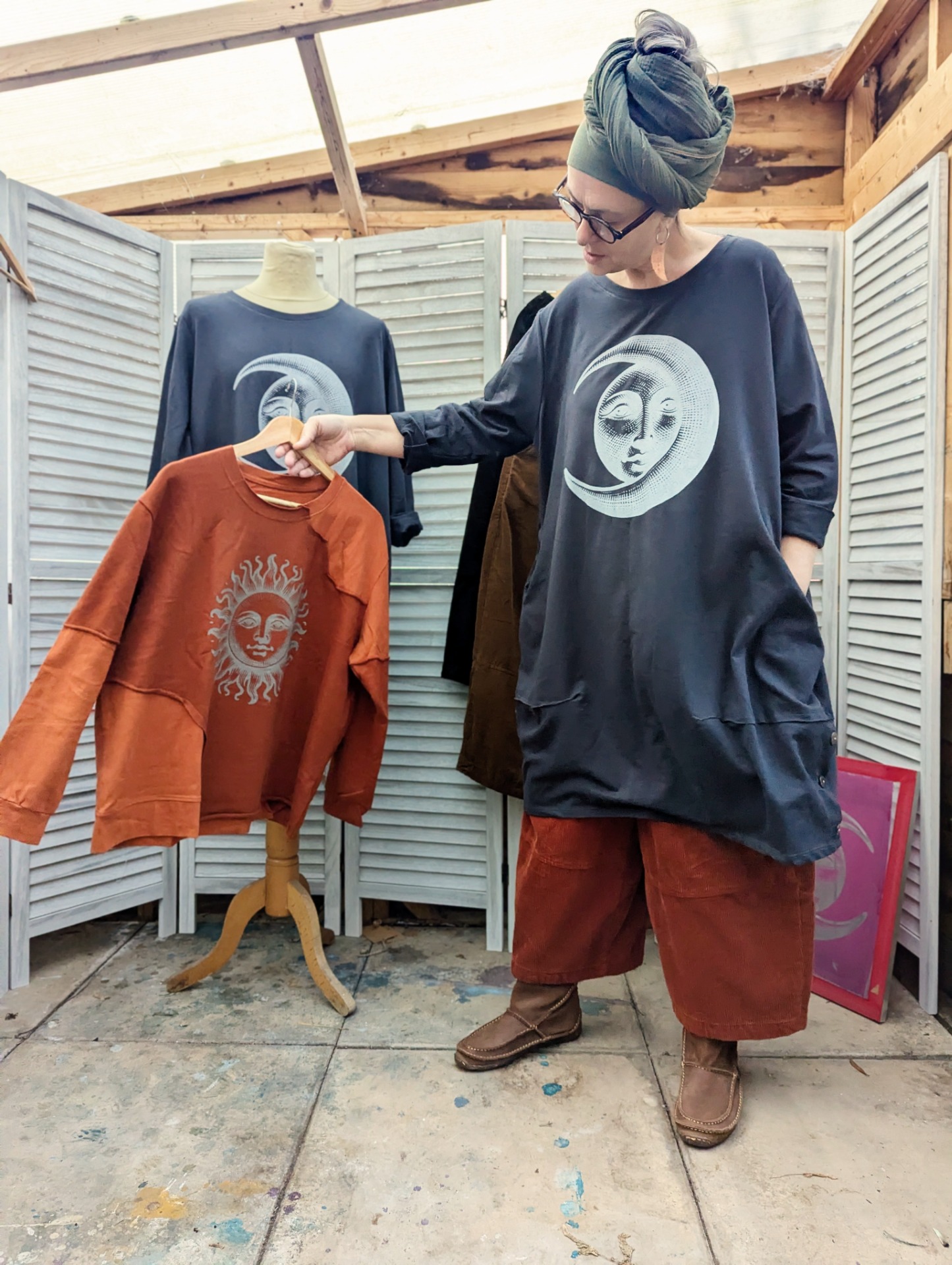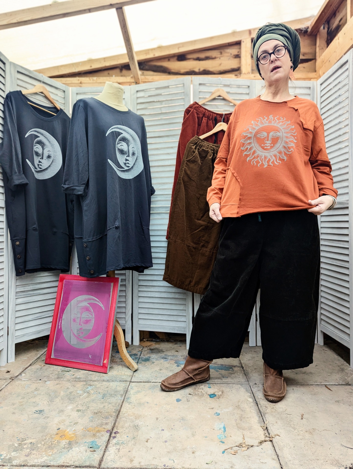 burnt ginger colour with out lovely 'sun face' screen print in a pale mushroom colour...fab.